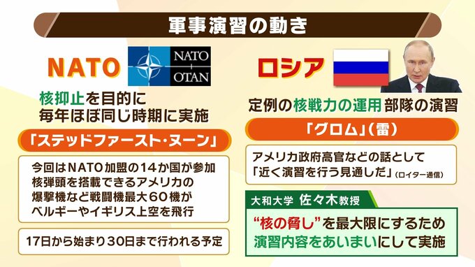 「核の脅しを最大限にするため、演習内容を曖昧にして実施するのではないかと思います。グロムはウクライナへの軍事侵攻前にも行われています。ロシアがいつ、どのような規模で行うかは言っていないんです。ロシア北方でノルウェー国境に近いコラ半島があります。ここに衛星写真で、戦略爆撃機を11機ぐらい既に駐留しているという話があります。となりますと、領空ギリギリを飛んで、戦略爆撃機が威嚇飛行する可能性がある。ウクライナ国境では例えばミサイル抑止部隊が共同作戦として動いたりすると『本当に打つのか』『本当に使うのか』という『核の脅し』になるんです。ウクライナの戦況を有利に持ち込もうとする意図が透けて見えます」
