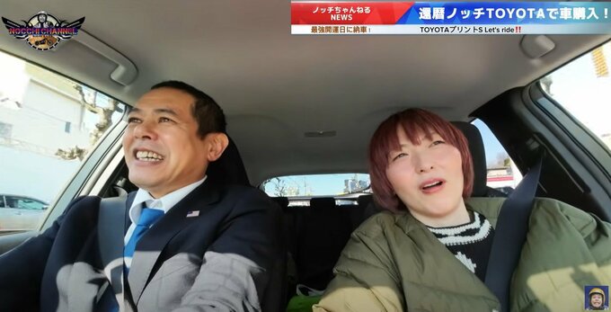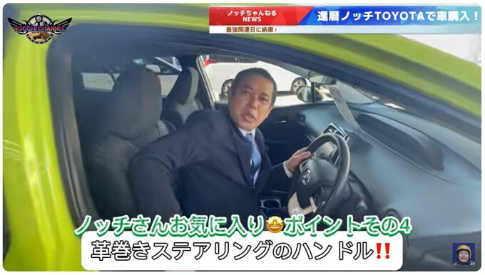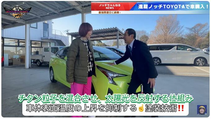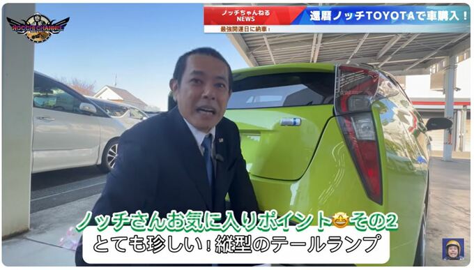 ノッチさんは、動画冒頭で「トヨタ『プリウス』でございます」と、ダブルピースをしながら愛車を紹介。