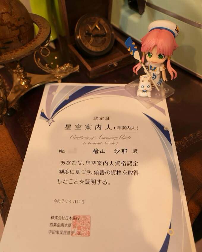 檜山沙耶さんは「星空案内人(準案内人)の資格を取得いたしました。」と綴ると、「認定証」の写真をアップ。