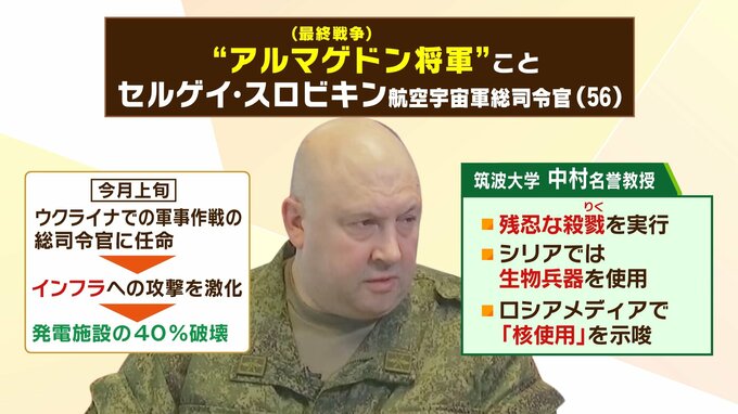 「過去にシリアで化学兵器・生物兵器を使ったと言われていますけども、プーチン大統領から勲章である『英雄賞』をもらっているんですね。彼は非常に残忍なやり方を行使するということで、ウクライナへの軍事侵攻では司令官の1人だったんですね、その時に弾幕砲火といって幕のように焼夷弾を投げることをやったと言われています」