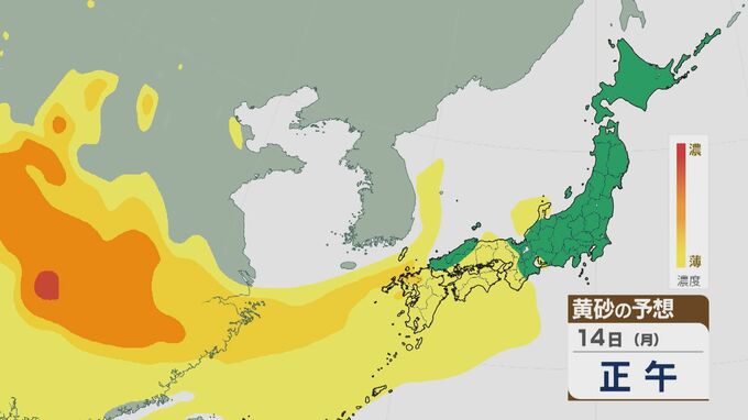 【黄砂情報】黄砂は14日の日中は九州から近畿で 夕方以降は東海や関東にも飛来する見込み 最新のシミュレーション 北陸放送 2025年4月14日(月) 09:22 国内 14日(月)は、日中は九州から近畿を中心に、夕方からは東海・関東でも黄砂が飛来する見込みです。 黄砂は、14日の日中は九州や中国・四国、近畿にかけてまで飛来しそうです。