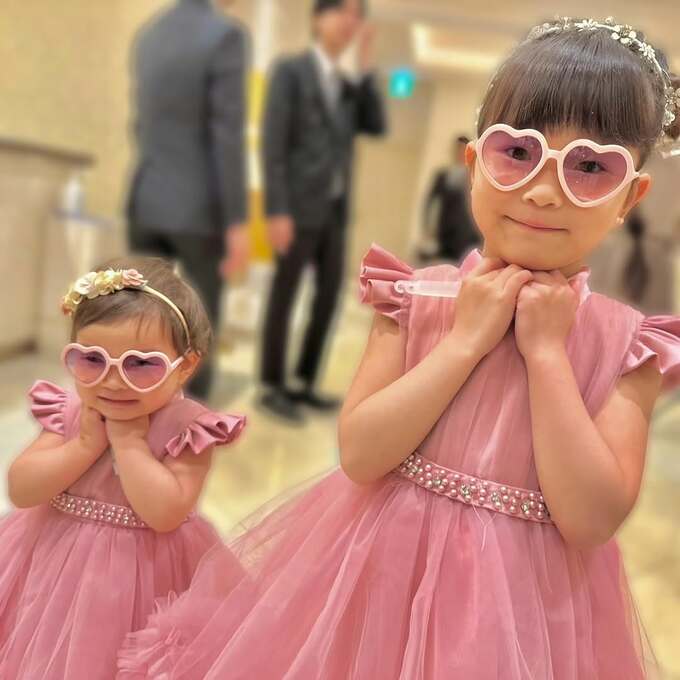 1枚目の写真には、フリルが施されウエストには装飾が付いているピンクのドレスを着たののちゃんと、妹のひーちゃんが、ハート型のサングラスをかけ、楽しげな表情を浮かべています。