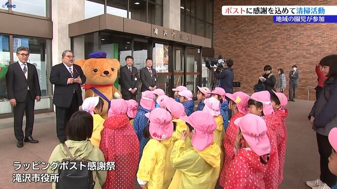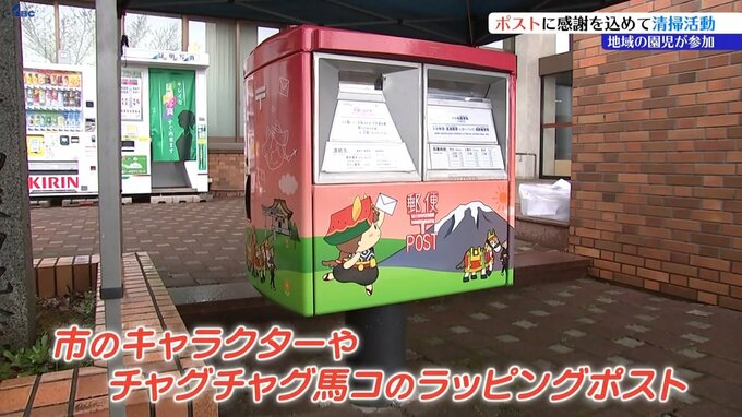 20日は郵便制度が始まった日にちなんだ郵政記念日です。これを前に岩手県滝沢市で地域の保育園児が、市のキャラクターや「チャグチャグ馬コ」のラッピングポストに感謝の気持ちを込めて清掃活動を行いました。