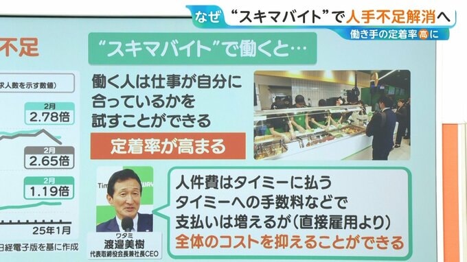 渡邉氏は「人件費はタイミーに払うタイミーへの手数料などで支払いは増えるが、(直接雇用より)全体のコストを抑えることができる」と話しています。