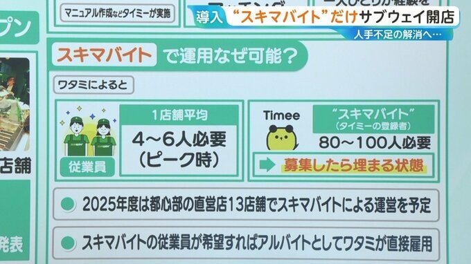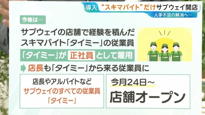 さらに、サブウェイの店舗で経験を積んだスキマバイト「タイミー」の従業員を、タイミーが「正社員」として雇用する流れもあります。