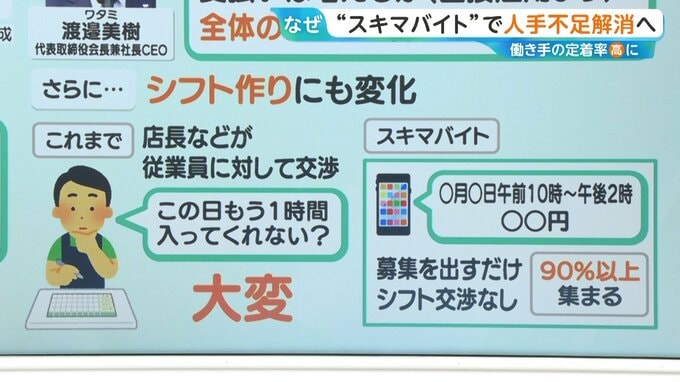 これまで、店長などが従業員に対して「この日にもう1時間入ってくれない?」などと交渉してシフトを組んでいましたが、スキマバイトでは「○月○日午前10時から午後2時まで○○円」という募集を出すだけで、90%以上集まる状態だそうです。