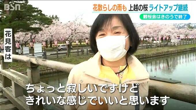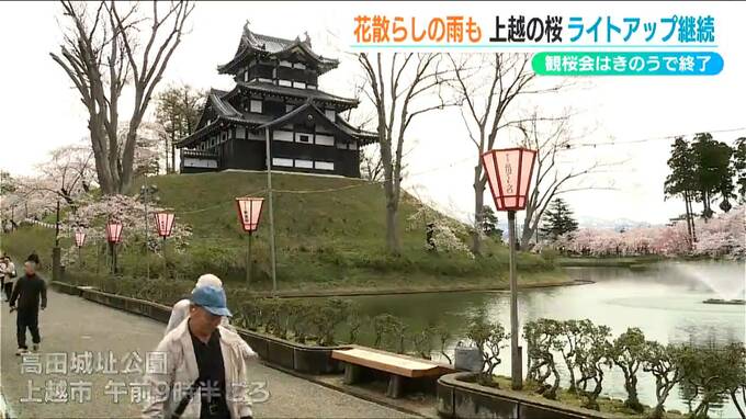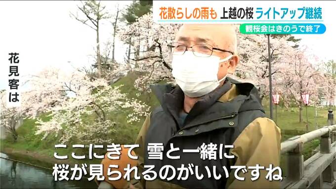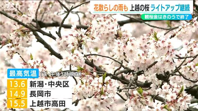 新潟県内の多くの地域で見ごろを迎えた桜。前日から続く花散らしの雨で14日は肌寒い一日となりました。ただ、まだ楽しめる桜もあり上越市の高田城址公園ではライトアップの継続を決めました。
