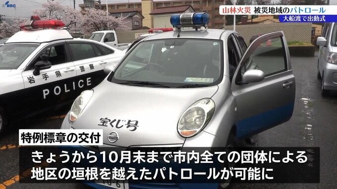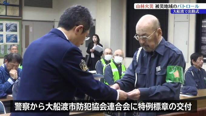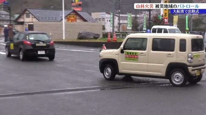岩手県大船渡市で、大規模な山林火災に見舞われた地域の犯罪を防ごうと青色回転灯を装備した車両による防犯パトロールの出動式が行われました。