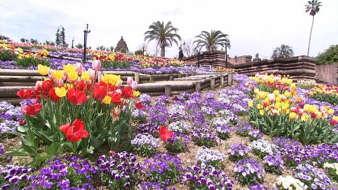 ビオラとの競演も楽しめるレオマリゾートのチューリップ祭は、今月(4月)20日まで開かれています。