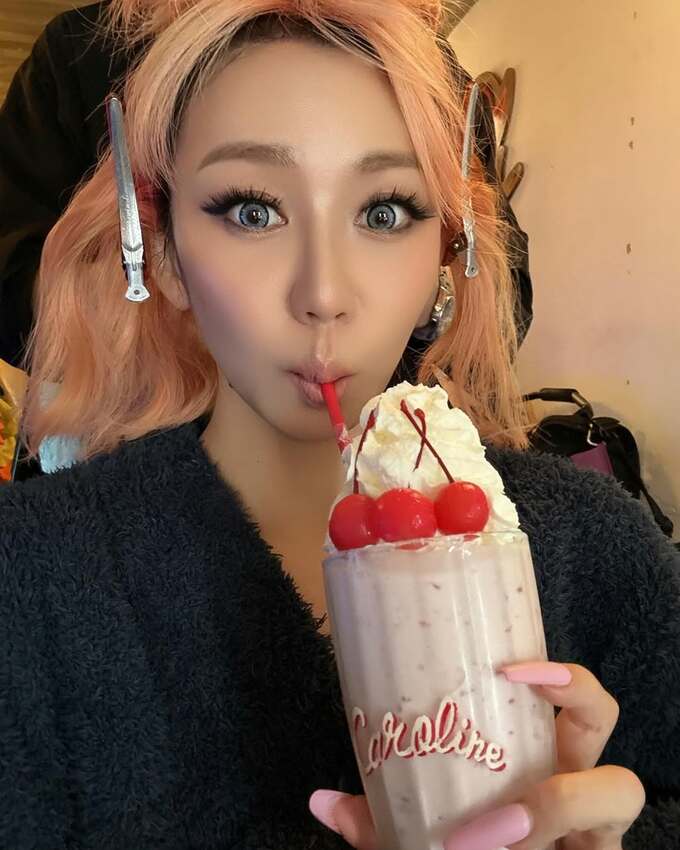 投稿された画像では、倖田來未さんが、大きなグラスに入ったシェイクを手に持った姿が。シェイクは、淡いピンク色の液体の上に、ふわふわとした山盛りのクリームと3つのチェリーが乗った、まさに絵になる一杯。