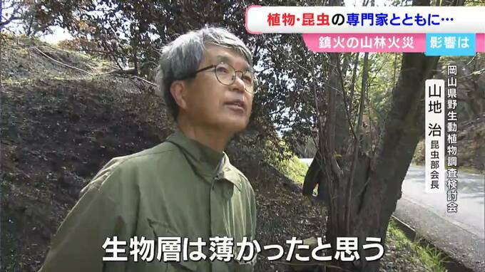 先月(3月)、岡山市南区で発生した山林火災は、鎮火から4日目を迎えました。人的な被害はありませんでしたが、山では様々な植物が育ち、生き物が生息しています。生態系への影響について、専門家に話を聞きました。