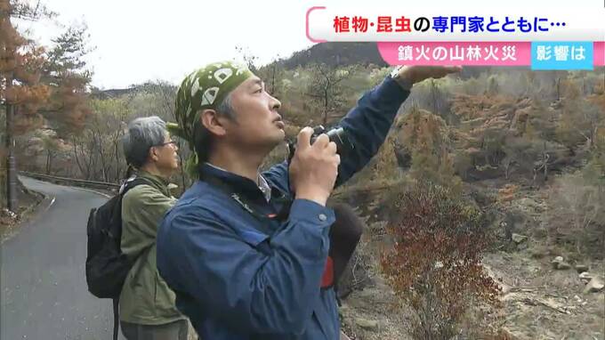 植物調査で、過去に継続的に現場を訪れたことのある、重井薬用植物園の片岡博行園長です。ともに見て回った山肌は、黒く焼けこげ、火災の激しさを物語っています。
