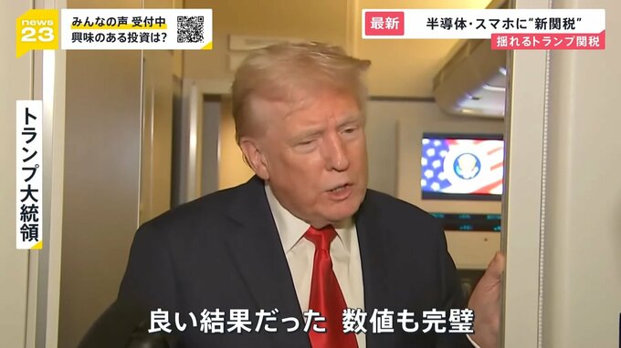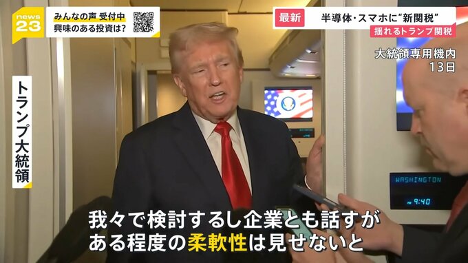 しかし、トランプ氏はSNSで「相互関税に例外はない」と述べ、”除外したわけではない”と強調したうえで、今回新たに「スマートフォンなどの電子機器を対象にした新たな関税を来週中にも発表する」と明らかにしました。