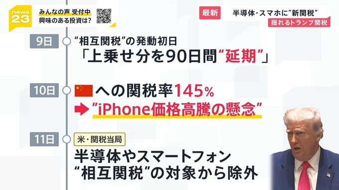一方、125%の報復関税で応戦した中国には関税率を145%に引き上げるとしたものの、大半を中国で製造する「iPhone」の価格高騰などへの懸念が噴出。