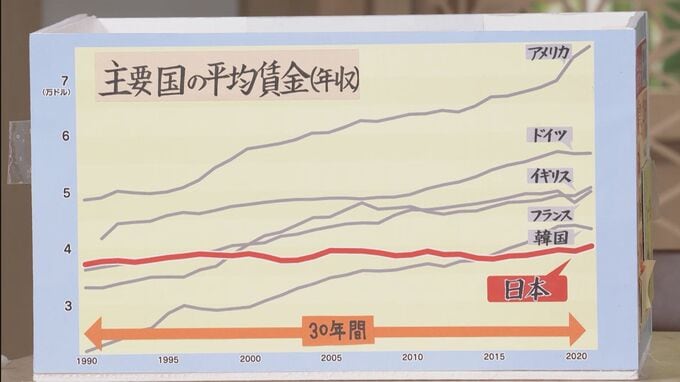 まず、年収ベースの賃金ですが、この30年間、他の主要国が上昇している中で、日本だけは横ばい状態が続いてきました。そもそも円安とは関係なく、日本の賃金は上がってこなかったわけです。