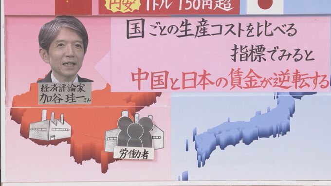 経済評論家の加谷珪一さんは、今回の円安、1ドル=150円のラインについて、「国ごとの生産コストを比べる指標でみると、中国と日本の賃金が逆転する」と指摘。そうなると、日本に来ていたベトナムなどの外国人労働者が、より高い給料を求めて中国へと流れる懸念があるといいます。