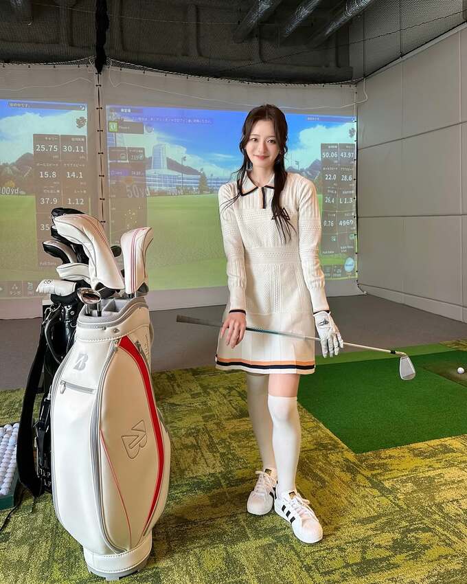 投稿された写真には、神谷さんがインドアゴルフ練習場に立つ姿が映し出されています。身に着けているのは、白を基調としたワンピースタイプのゴルフウェアです。足元には白いニーハイソックスとスポーツシューズを合わせ、手にゴルフクラブを持ち、カメラに向かって微笑んでいます。