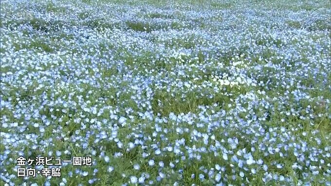 宮崎県日向市では、およそ1万本のネモフィラが見ごろを迎え、訪れた人たちを楽しませています。一面に広がる青色のじゅうたん。日向灘を一望できる日向市幸脇の「金ヶ浜ビュー園地」では、10アールの敷地におよそ1…