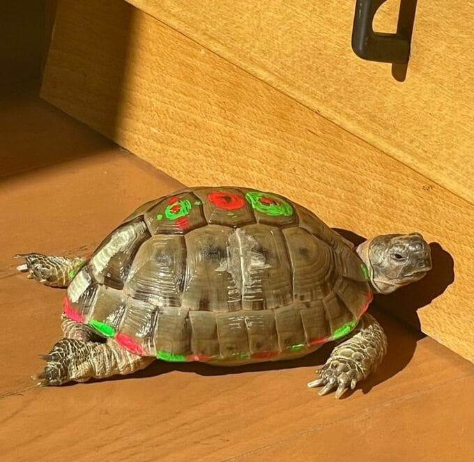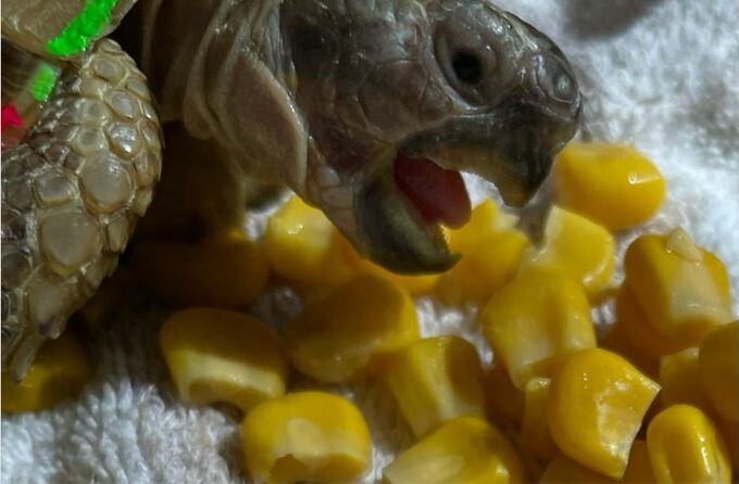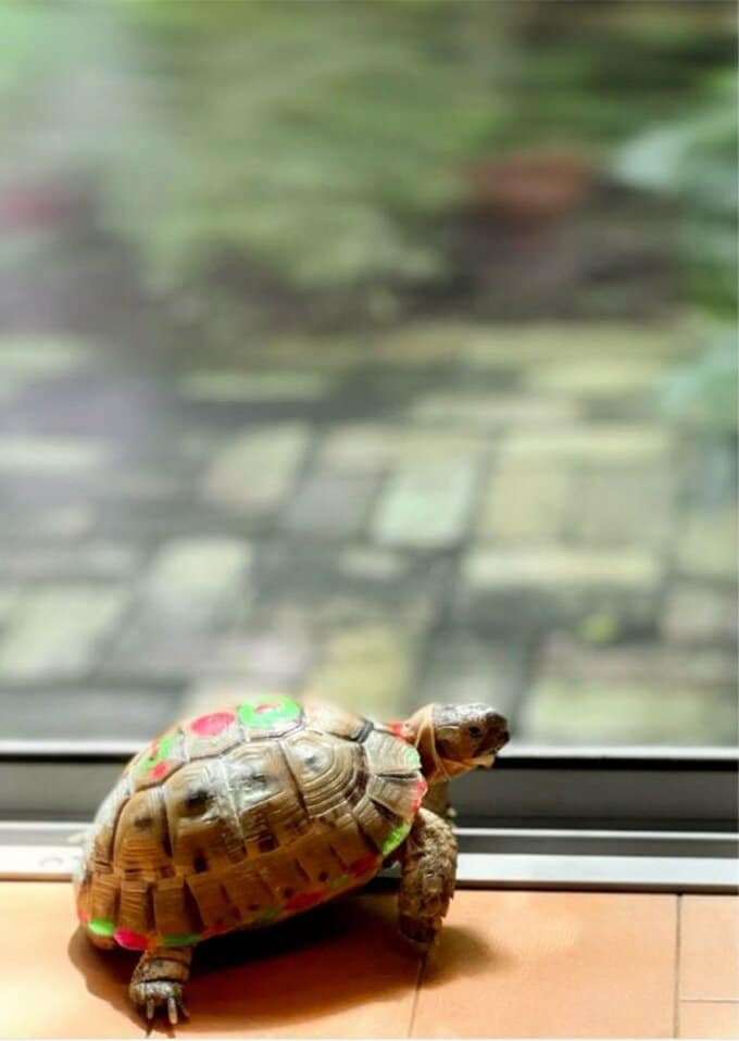 続けて、「交番に、遺失物届けも出しに行った。10日ほど前に、2匹の陸亀が届いたとのこと。預かっているのですが、最近は葉っぱを食べて、可愛いですよね、亀ちゃん。とお巡りさんたちが微笑んだ。写真も見せて、書類に似顔絵も書いた。、特徴。甲羅にピンクと緑の蛍光色縁取り。と記した。コーンしか食べない、、など。じゃ、違いますね。とのことでした。」と遺失物届を提出していたことも明かしました。