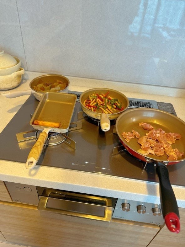 「今日は親子丼のリクエストでした!」という日は「コンロがフル回転です笑」と、3口のコンロが大小のフライパンや卵焼き器に占領されている様子を投稿。「今日は私もお弁当でした!!」と、長男のお弁当と同じ中身にして時短を心がけている模様。