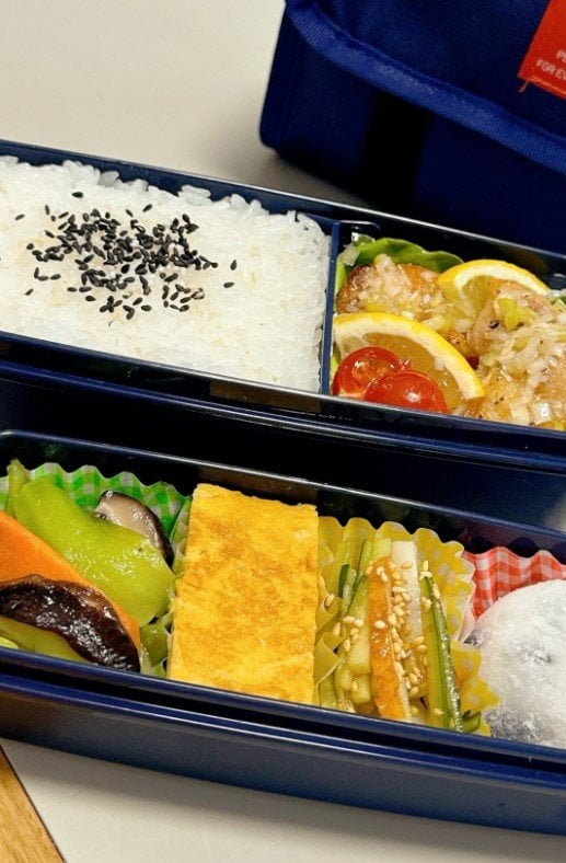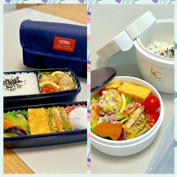 続く投稿でも「今日の長男と私のお弁当です」と、四角い紺色の長男のお弁当箱と、丸くて白い小倉さん自身のお弁当箱を並べて披露。「今日は、チキンソテー ネギ塩ダレです!」と投稿していますが、それ以外にも卵焼きや野菜のごま和えで品数を増やして栄養バランスを心がけている模様。