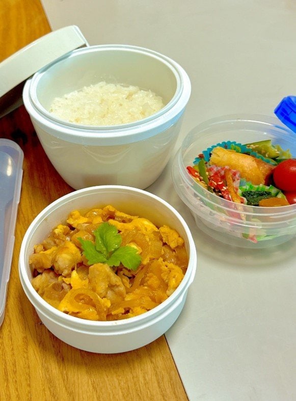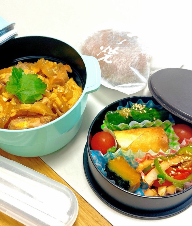 親子丼用のための “鶏肉と玉ねぎの卵とじ煮” だけでなく、春巻・野菜のごま和え・カボチャの煮付けなども詰められた品数豊富なお弁当を披露しつつ「少しずつお弁当作りのルーティンが見えてきました」と充実感を見せています。