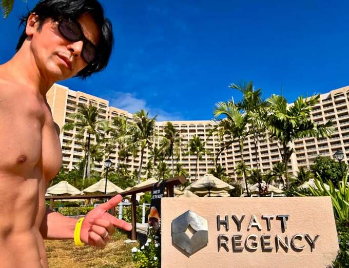 続けて「今回の滞在は ハイアットリージェンシー」「プライベートビーチに出てみました」と、説明しています。