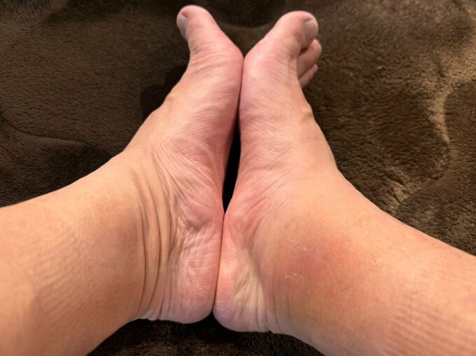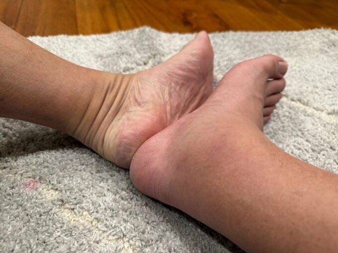 エハラさんは「同じ足とは思えないくらい腫れきっとる。」とテキストして、左足と右足の裏同士を合わせるような格好の写真を投稿していますが、左足に比べて、右足が倍くらいの大きさに腫れ上がっていて、本当なら足首のくびれがあるところが真っ直ぐの円柱のようになってしまっています。