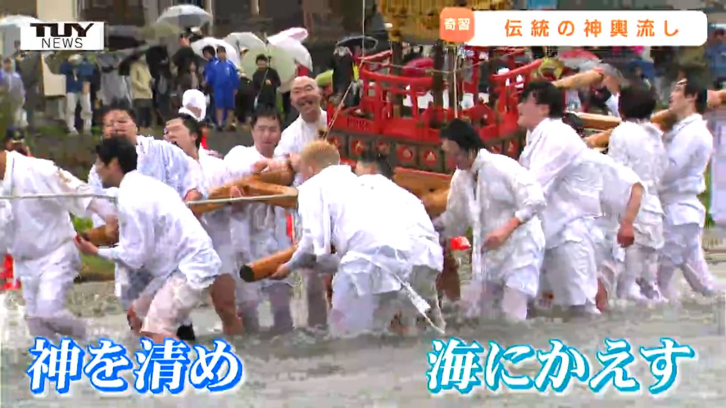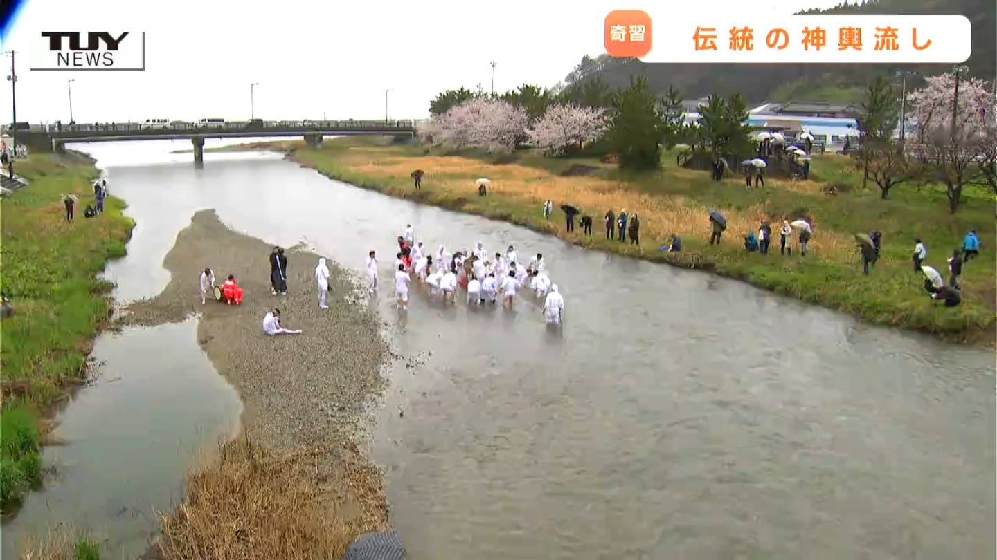 きょう鶴岡市で、春の伝統行事「鼠ヶ関神輿流し」が豪快に行われました。