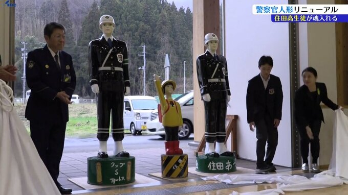 交通事故を防止しようと住田町に設置されていた警察官人形の補修が終わり15日お披露目されました。補修作業を行ったのは地元の高校生たちです。