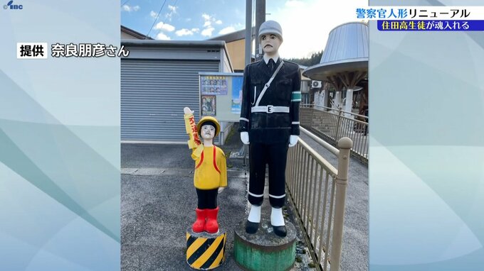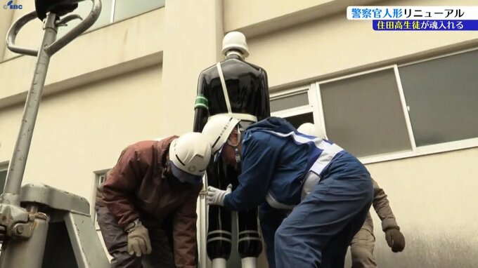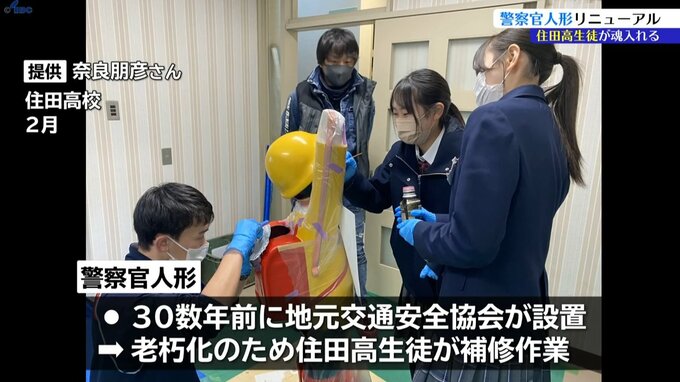 この警察官人形は交通死亡事故が絶えなかった30数年前に、安全を祈願して地元の交通安全協会が設置したもので、老朽化が激しくなったため2025年2月中旬、住田高校の生徒13人が人形の補修作業を買って出ました。