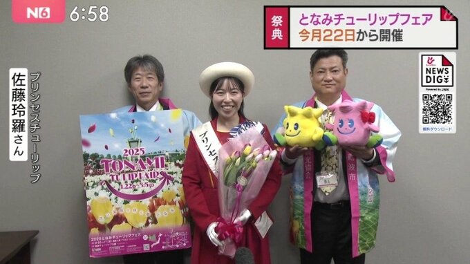 となみチューリップフェアをPRしようと、プリンセスチューリップの佐藤玲羅さんや市の関係者がチューリップテレビを訪れました。4月22日から5月5日まで開催されるチューリップフェアは、「花と笑顔の咲く春となみ…