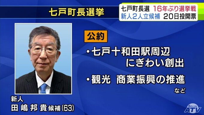 田嶋 氏は30年以上にわたって、町の職員を勤めました。七戸十和田駅周辺の賑わい創出や、観光・商業振興の推進など町の特徴を活かしたまちづくりを進めたいとしています。