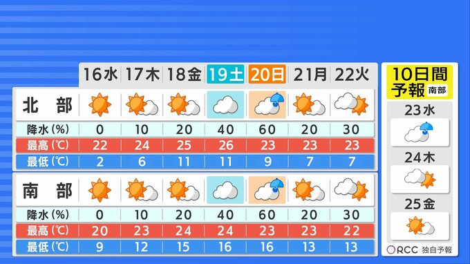 あすはきょうと比べると一気に昼間の気温が高くなります。朝は0℃近くまで冷え込む地点もありますが、昼間の気温は5℃~10℃ほどきょうより高くなり、特に北部や内陸部ではきょうより10℃以上高いところもあるでしょう。場所によっては一日の気温差が20℃ほどになる見込みですので、体調を崩さないようご注意ください。脱ぎ着のしやすい服装でお過ごしください。また紫外線対策もしっかりした方が良いでしょう。