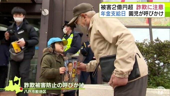 2024年の同じ時期と比べ、被害額が2億円以上増えている特殊詐欺。青森県八戸市では15日、園児たちが警察官と一緒に注意を呼びかけました。園児の呼びかけ「詐欺に気を付けてください!」八戸市鮫地区の防犯協会は…