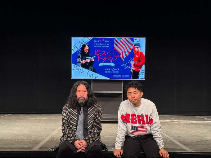 投稿された写真には、「ピーストークライブ」の告知用のモニターをバックに久々の2ショットを公開。ロン毛に長いヒゲを蓄えた相方、又吉さんの変貌ぶりが注目されています。