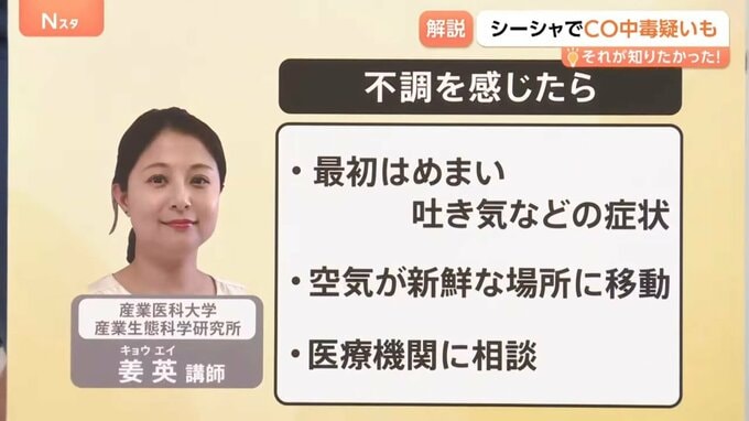 不調を感じた場合について、産業医科大学・産業生態科学研究所の姜英講師によると、「最初はめまいや吐き気などの症状が出る。それを感じた場合は、空気が新鮮な場所に移動をし、それでも症状が改善しない場合は、医療機関に相談することが重要」といいます。