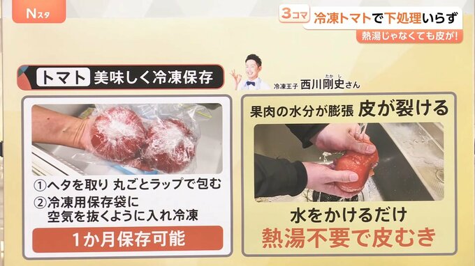 冷凍することにより、果肉の水分が膨張し、皮が裂けます。水をかけるだけで、熱湯不要で皮むきが簡単にできるということです。
