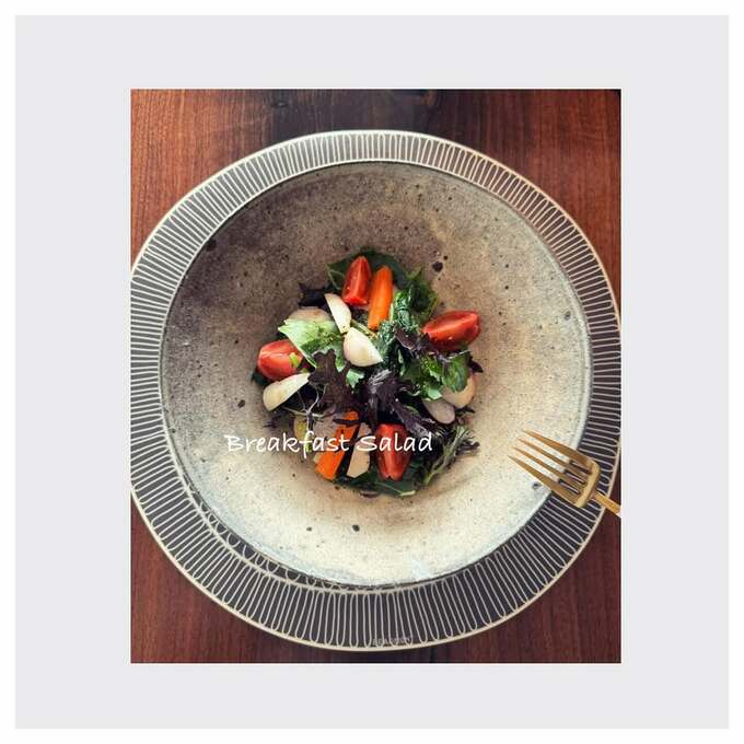 投稿された写真には、お洒落な器に色とりどりの野菜が綺麗に盛り付けられたサラダの写真に「Breakfast Salad」と記されています。
