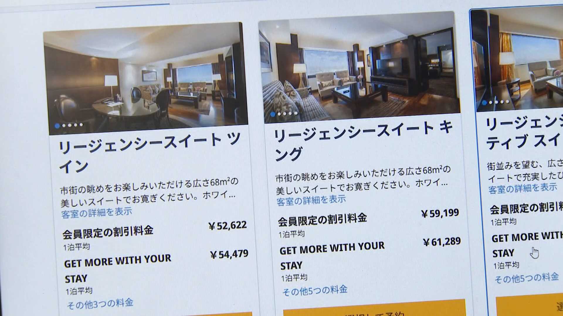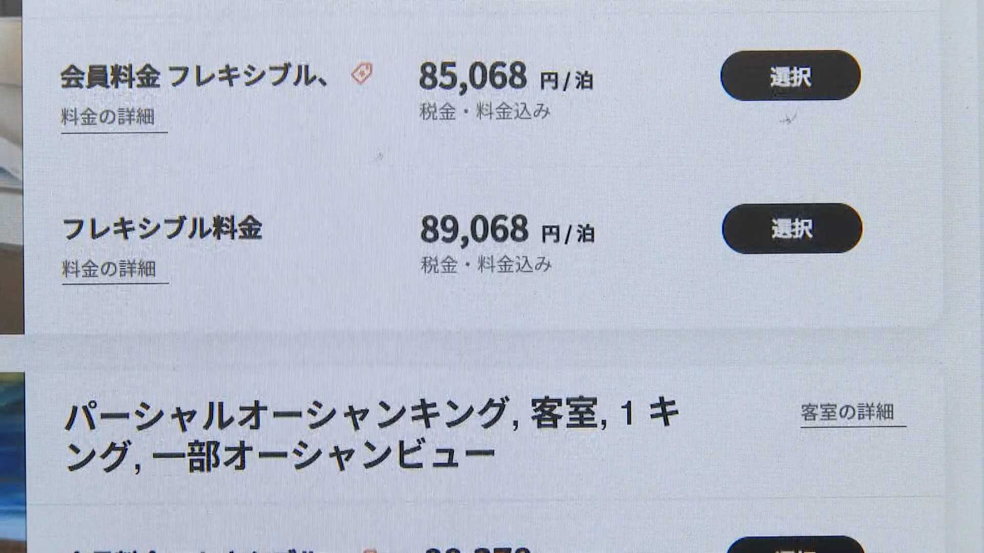 「部屋を見てみますと安いところだと2万円台から3万円台のものがあります。ただ6万円台の部屋のものとなりますと、こちらのスイートを開いてみますと5万から6万円台があります」