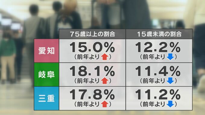 人口を年齢別に見ると、75歳以上の割合が愛知県で15.0%、岐阜県で18.1%、三重県は17.8%といずれも前の年より上がっています。一方で、15歳未満の割合は3県いずれも前の年より下がっています。