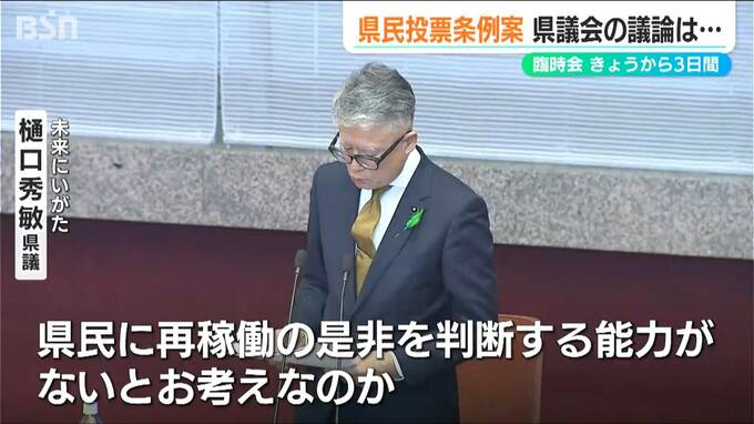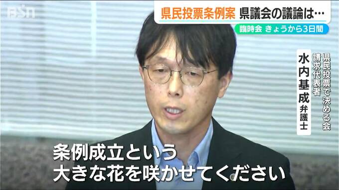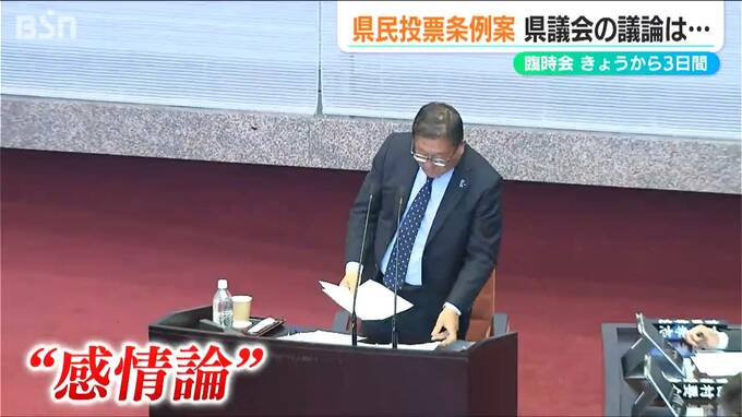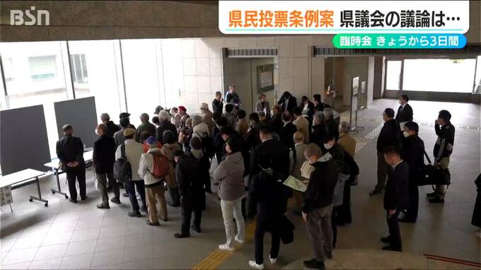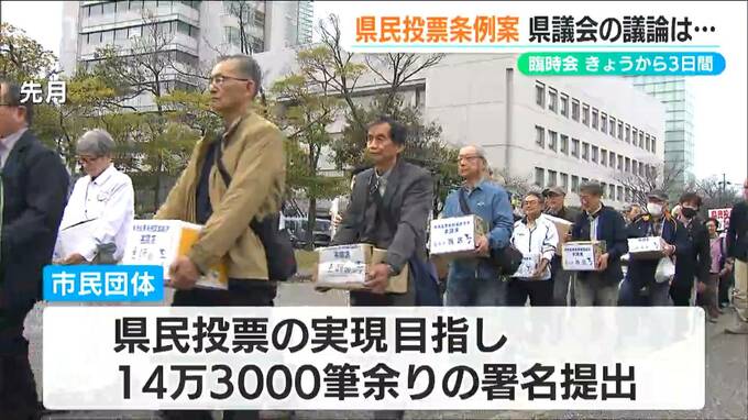 県民投票の実現を目指す市民団体が14万3000筆あまりの署名を集めて知事に直接請求したもので、2日間に渡って県議会で審議し、最終日の3日目で条例案を可決するかどうかを決めます。