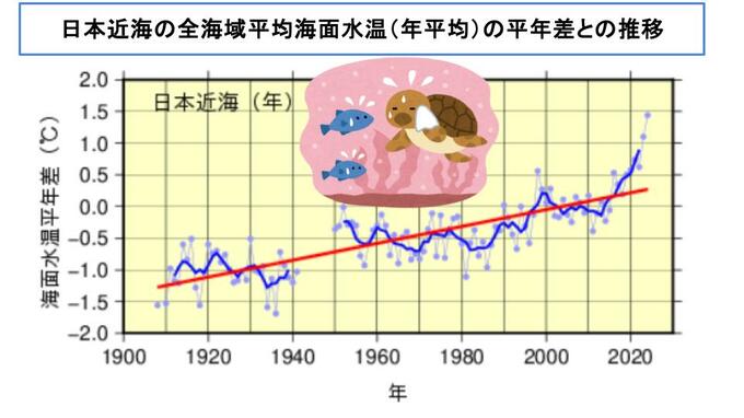 2024年までの日本近海の海面水温(年平均)は100年あたり+1.33℃という上昇率です。これは世界全体での上昇率、+0.62℃と比較しても非常に高く、特に日本海のあたりでは+2.01もの上昇が観測されているのです。