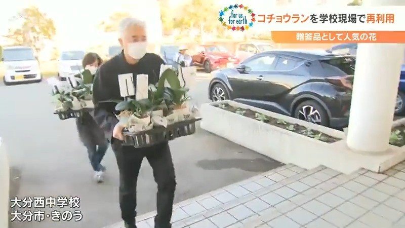 廃棄される花を減らすエコな取り組みは教育現場にも広がり始めています。大分市の大分西中学校ではコチョウランを再利用する活動に賛同し、およそ25株が20日、生徒たちに手渡されました。