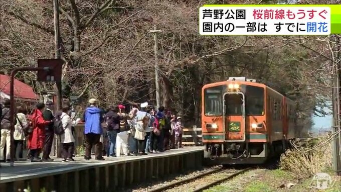 一番の目当ては“サクラのトンネル”と「津軽鉄道」 開花はまだしもサクラの名所「芦野公園」は観光客でにぎわう 見頃の「ウメ」に続き18日にも「サクラ」開花の見込み 青森県五所川原市金木町