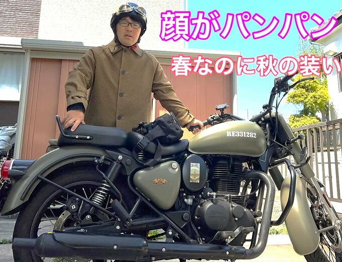 拓さんはオープンタイプのヘルメットにゴーグルを備え、カーキ色のコートを着込んでボタンを一番上まで閉める防寒ぶり。真昼以外の時間帯ではまだ肌寒いこともあるこの時期に備え「春なのに秋の装い」と入れつつも、ミリタリー調の車体に映えるコーデぶり。さらに「顔がパンパン」となぜか自虐しています。