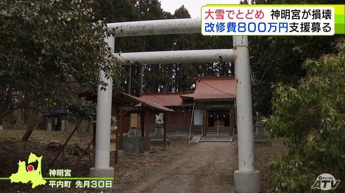 「大雪がとどめを刺した」地域で守り続けた神社 大雪で社殿はゆがみ・橋げたは崩壊… 改修費用は約800万円 宮司が“決断”クラウドファンディングに挑戦「やれることは何でもやりたいなと」 青森テレビ 2025年4月20日(日) 11:30 国内 この冬の大雪で、400年近くの歴史を持つ青森県平内町の「神明宮」で社殿の一部が壊れる被害がありました。 修理には約800万円がかかり、クラウドファンディングで一部の資金を募っています。