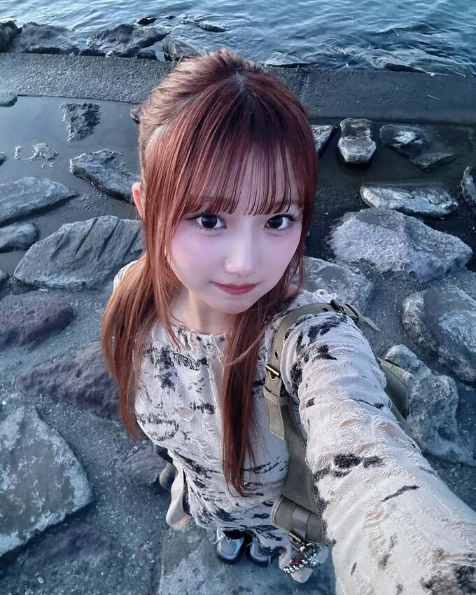 希空さんは「葛西臨海公園綺麗だった」と一言だけテキスト。ガーゼ風のダメージ生地にグレーのパターンが入ったオフホワイトの長袖カットソーにデニムのミニとカーキのショルダーバッグを合わせ、ちょっとアンニュイの表情でたたずんでいます。