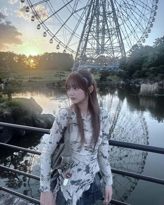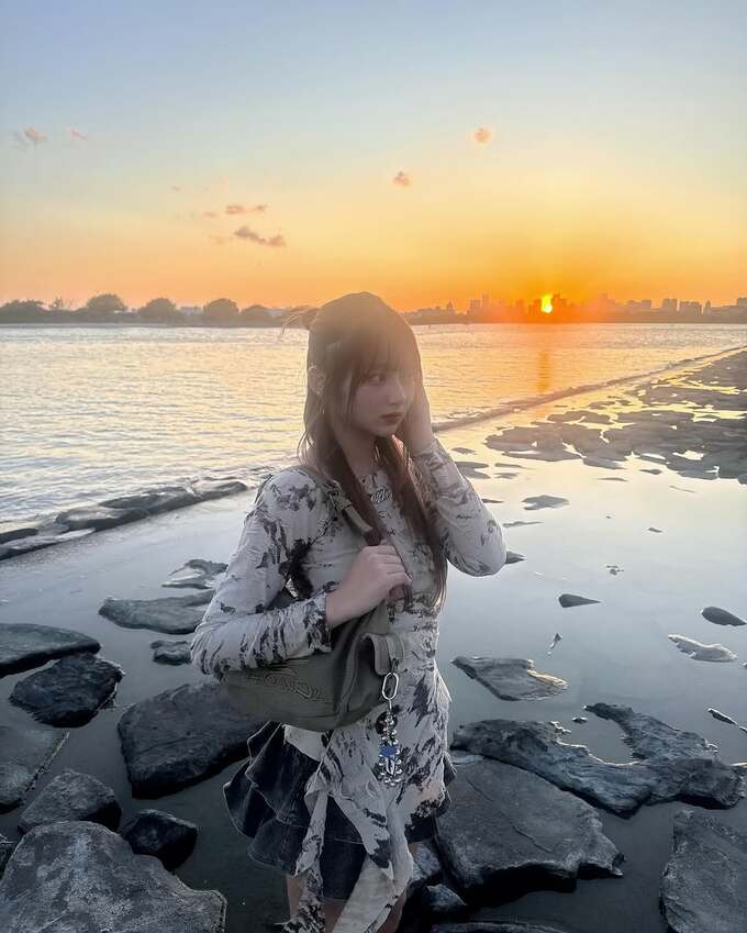 希空さんは、観覧車を向こうにみやる池の前でポーズ、次いで公園と海が接する波打ち際で自撮り。最後に、海ときらめく夕日をバックに2ポーズを投稿しています。