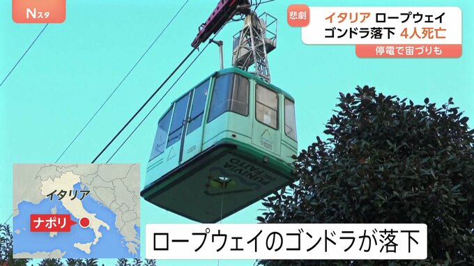 イタリアでロープウェイのゴンドラが落下し、4人が死亡しました。山の斜面の木々がなぎ倒された現場。その中にうっすら確認できるのはロープウェイのゴンドラです。黄色い服を着た救助隊が駆け寄っていきます。イ…